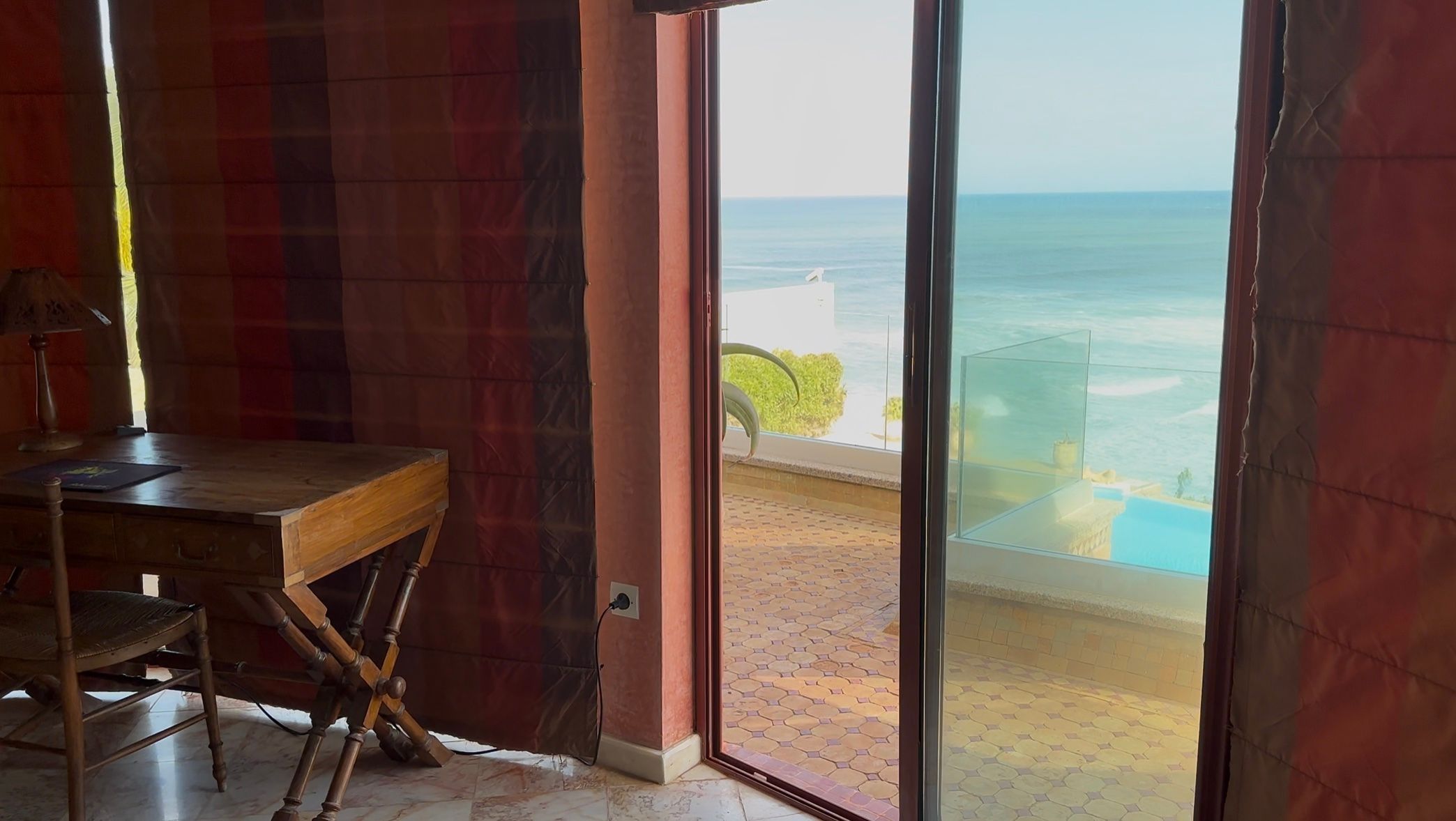 Master Ocean Suite — Top-floor luxury suite with a private balcony and spectacular views over the ocean and pool. Features an extra-large, marble-finished private bathroom. Also suitable for couples. BOOKED